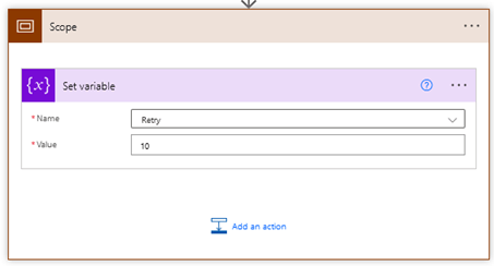 Step 4: Insert a second scope control to run after ‘Try’ is successful or skipped. Inside it set the Retry variable to 10. This functions as an off ramp for the repeating logic and allows your flow to continue if/when the template fires correctly.