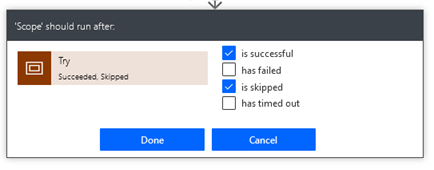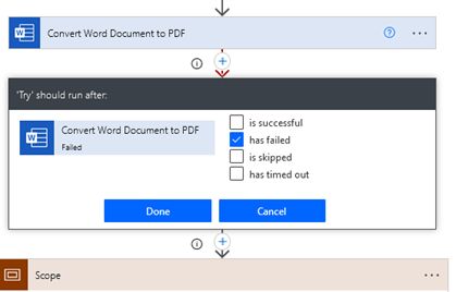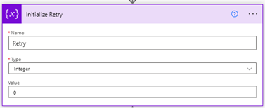 Step 3: Insert a scope control called ‘Try’. Configure Run After to ‘has failed’. Inside the Try control, increment the Retry variable by 1 and set a condition block to email you if the ‘Retry’ variable makes it to 10.