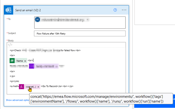 @{concat(‘https://emea.flow.microsoft.com/manage/environments/’, workflow()[‘tags’][‘environmentName’], ‘/flows/’, workflow()[‘name’], ‘/runs/’, workflow()[‘run’][‘name’])}